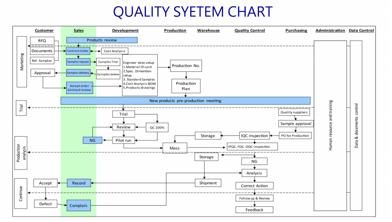 Mes surengiame susitikimą dėl kiekvieno naujo užsakymo prieš gamybą, visi vadovai ar operatoriai iš atitinkamų skyrių turi dalyvauti susitikime. QC vadovas turi užrašyti visus kokybės reikalavimus ir į dalykus, į kuriuos reikia atkreipti dėmesį.